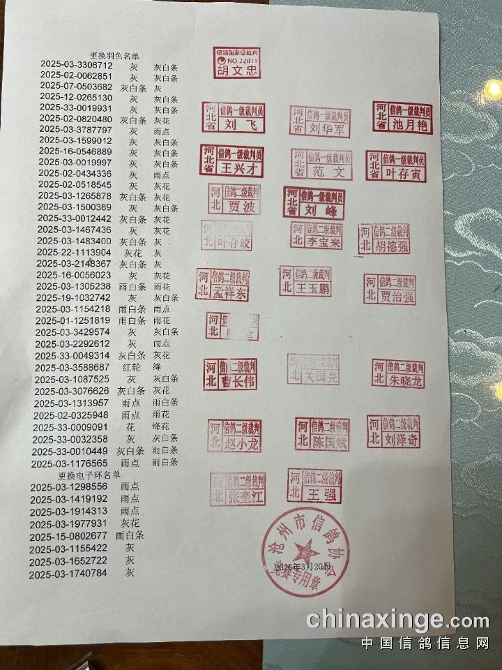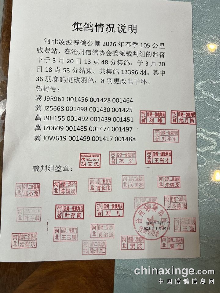 • 河北凌波公棚:105公里收费站集鸽数据 (2026-3-20 20:02:12)