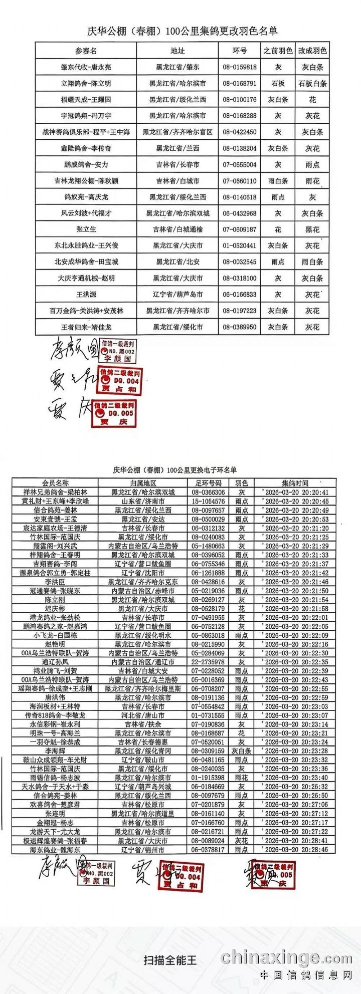 庆华公棚(春棚)3月15日训放63公里扫描名单(不排除有漏扫,电子环丢失或损坏)