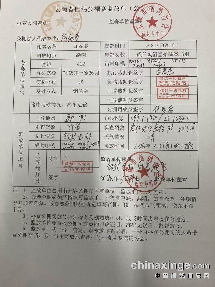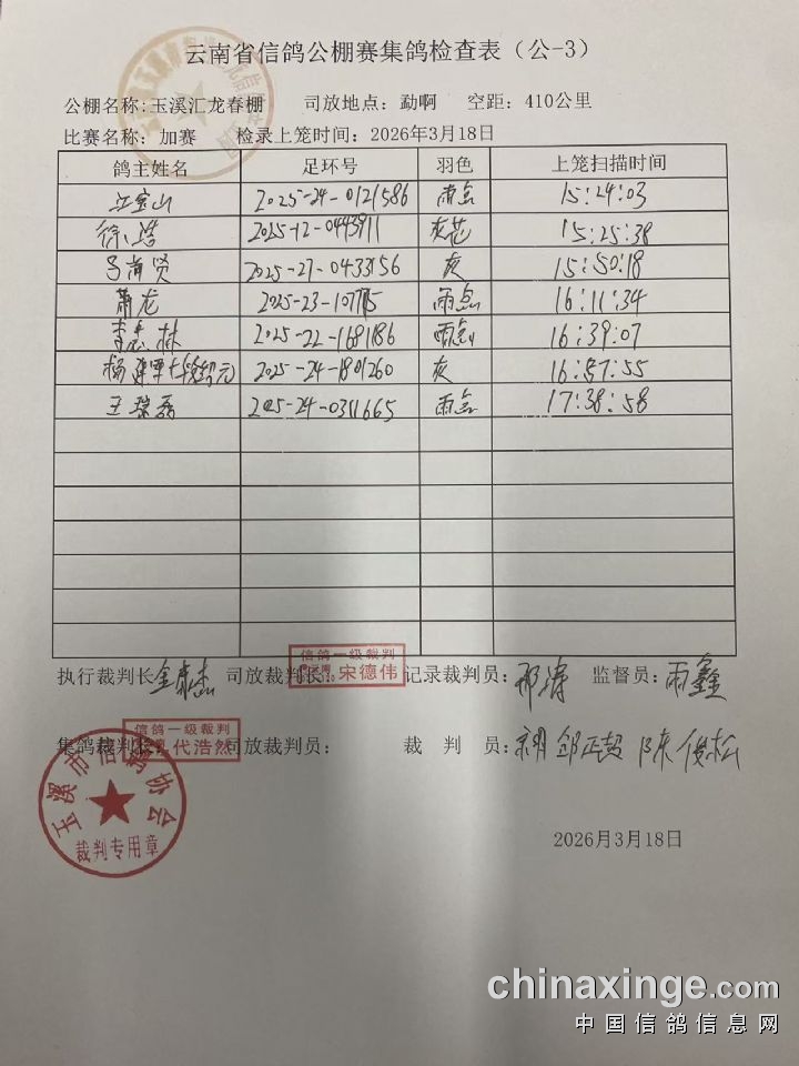 翔进汇龙春棚:决赛不拍卖获奖鸽发运登记清单