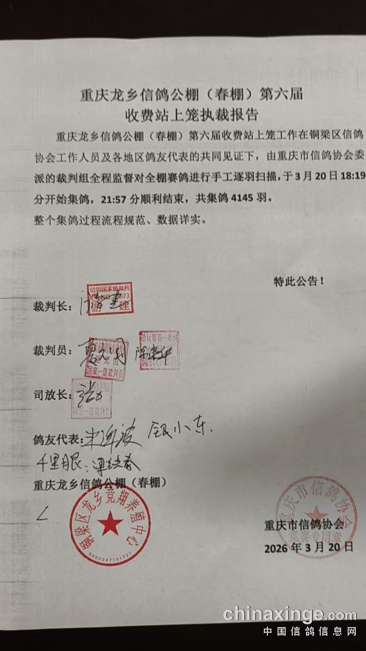 重庆龙乡信鸽公棚(春棚)2026年第六届第八站训放公告
