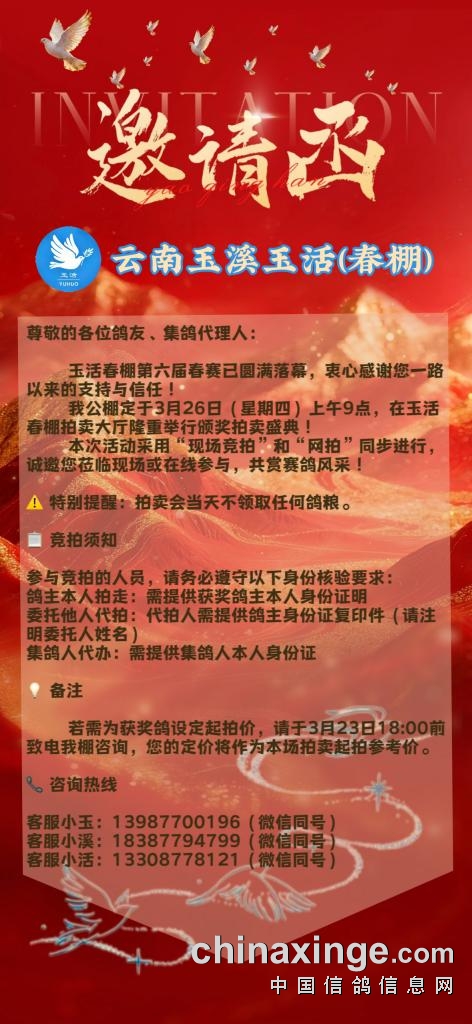 • 云南玉活(春棚):加站赛鸽粮领取通知 (2026-3-20 10:05:44)