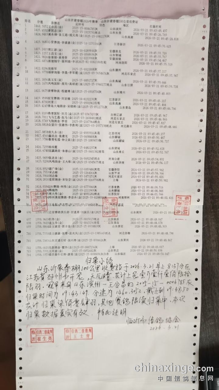 山东沂蒙春棚2026年100公里收费站集鸽数据(按时间)
