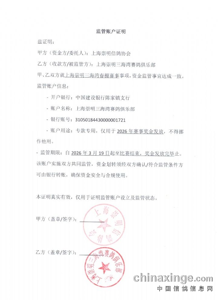 (一)崇明信鸽协会监管账户: