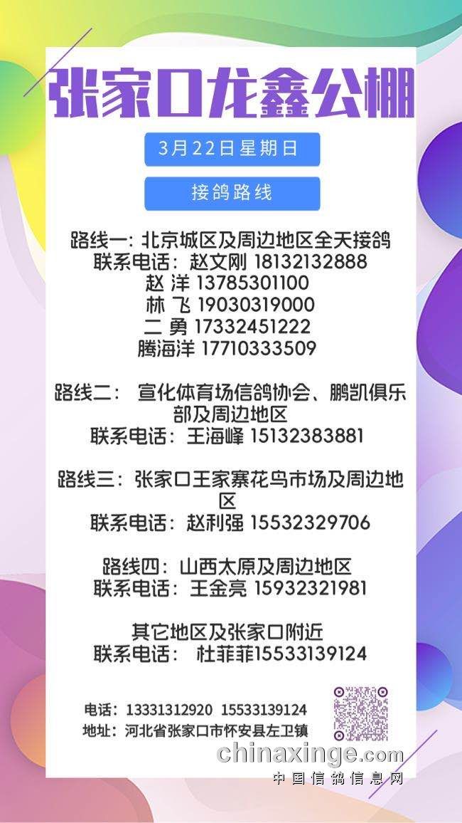张家口龙鑫公棚3月22日接鸽路线