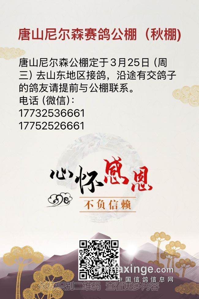 唐山尼尔森公棚3月25日(周三)山东地区接鸽通知