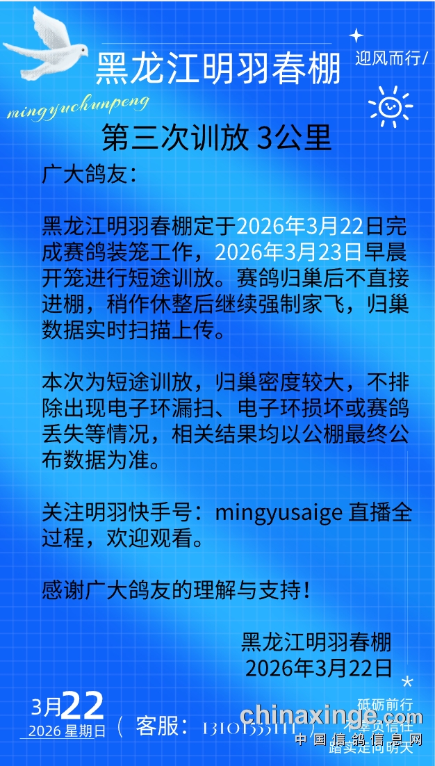 黑龙江明羽春棚3月23日第三次训放 3公里公告