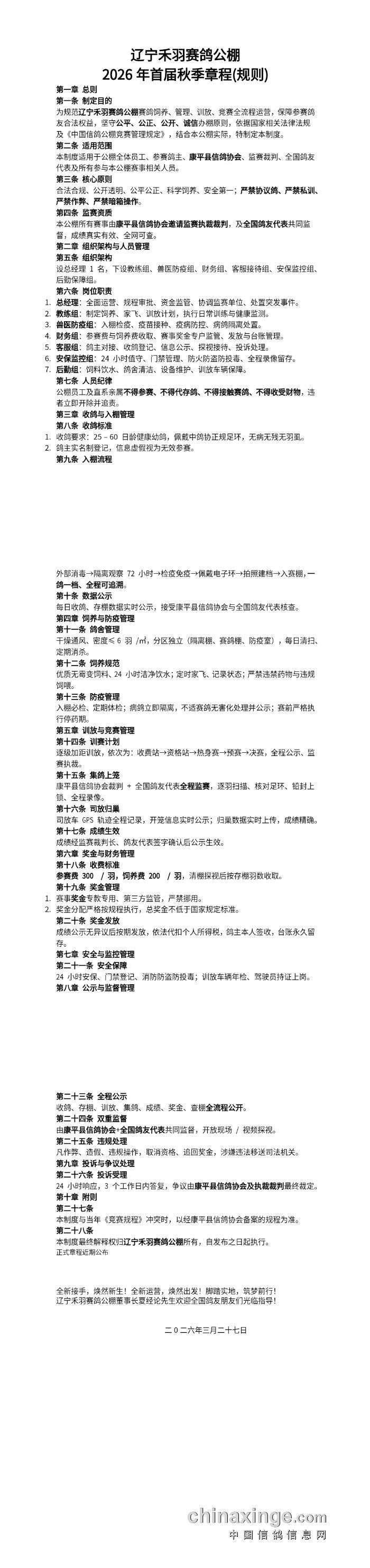 辽宁禾羽赛鸽公棚2026年首届秋季章程(规则)