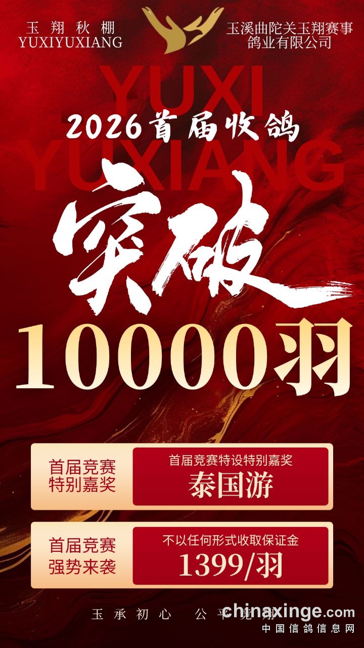 万羽汇聚,共襄盛举; 千心汇聚,同赴征程。 截止2026年3月28日玉翔赛鸽中心收鸽突破10000羽! 奖设泰国游,不负热血; 费定1399,不设保证金。 玉承初心,公平竞翔, 愿与诸君,共逐赛场荣光!