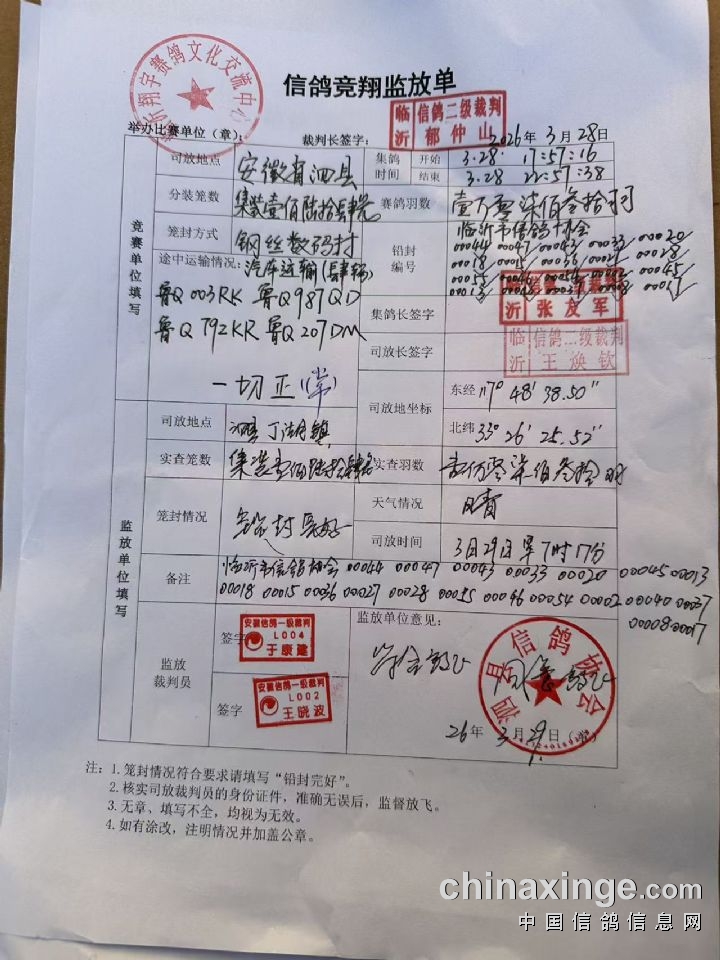 • 山东翔宇春棚(小棚)资格赛集鸽数据(按顺序) (2026-3-28 23:38:01)
