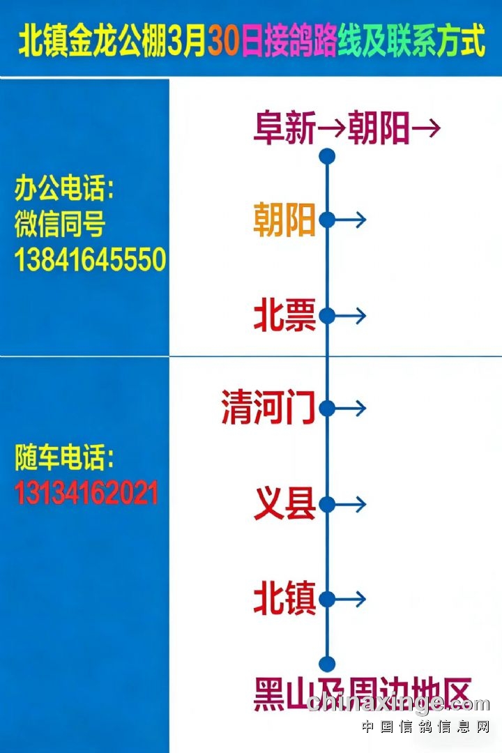 北镇金龙公棚3月30日(周一)接鸽路线
