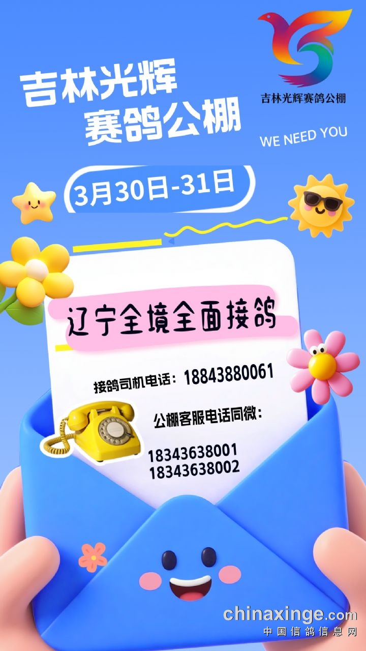 吉林省光辉赛鸽公棚3月30日-31日辽宁全境全面接鸽