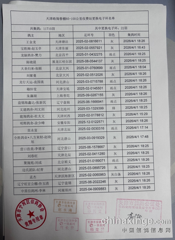 天津皓翔春棚85-100公里收费站更改羽色名单