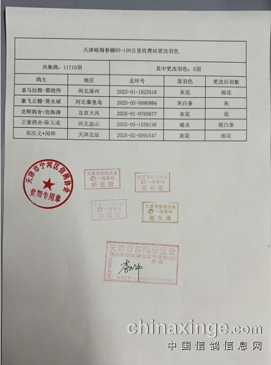 天津皓翔春棚85-100公里收费站更改羽色名单