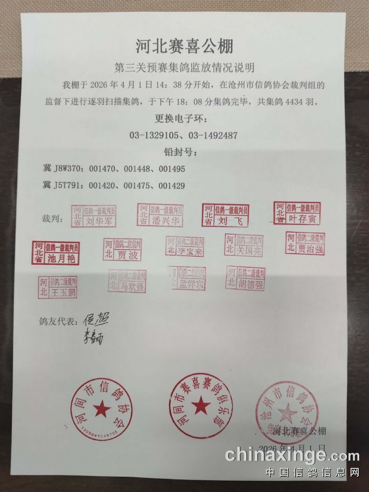 赛喜(春棚):第三关预赛集鸽监放情况说明