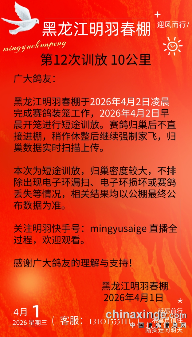 黑龙江明羽春棚4月2日第十二次训放 10公里公告