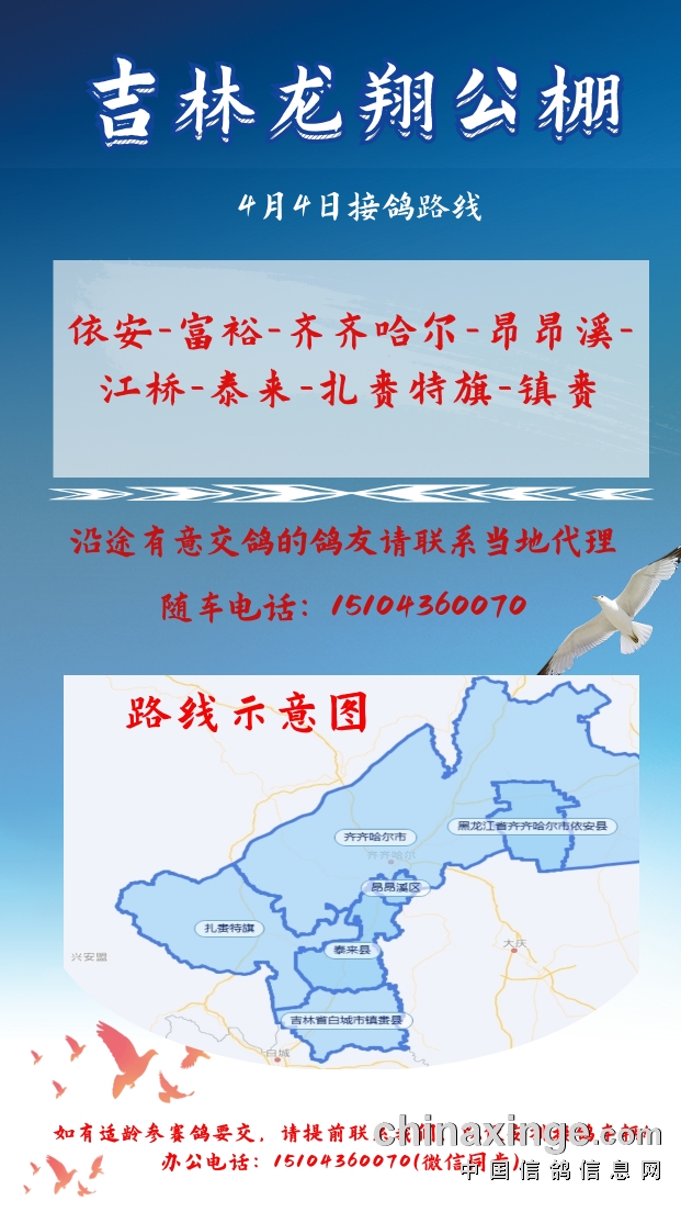 吉林龙翔:4月4日接鸽路线(齐齐哈尔方向)