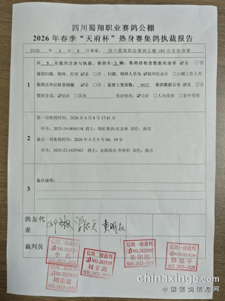 四川蜀翔职业赛鸽公棚2026年春季“天府杯”热身赛集鸽执裁报告