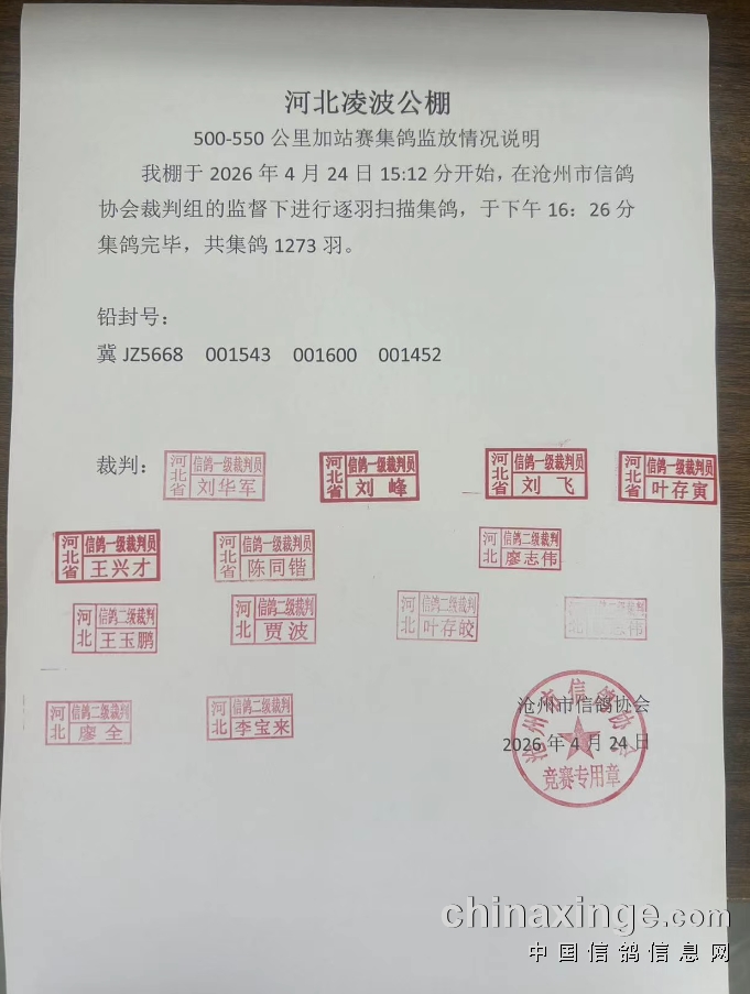 河北凌波公棚:500-550公里加站赛集鸽清单