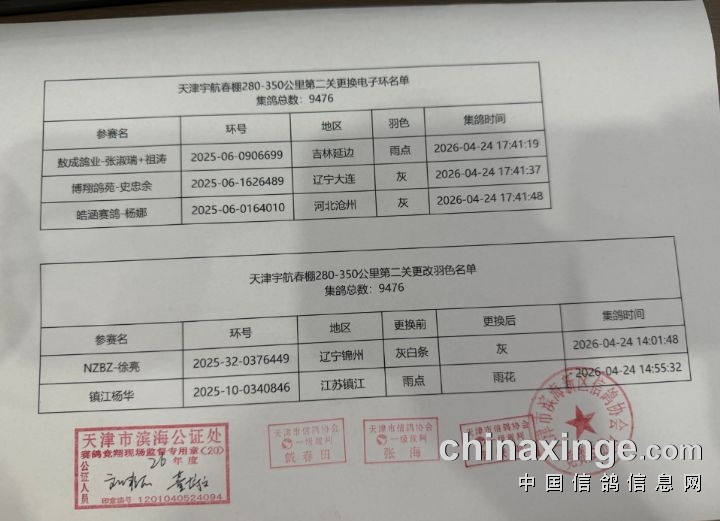 天津宇航春棚280-350公里第二关更换电子环及更改羽色名单