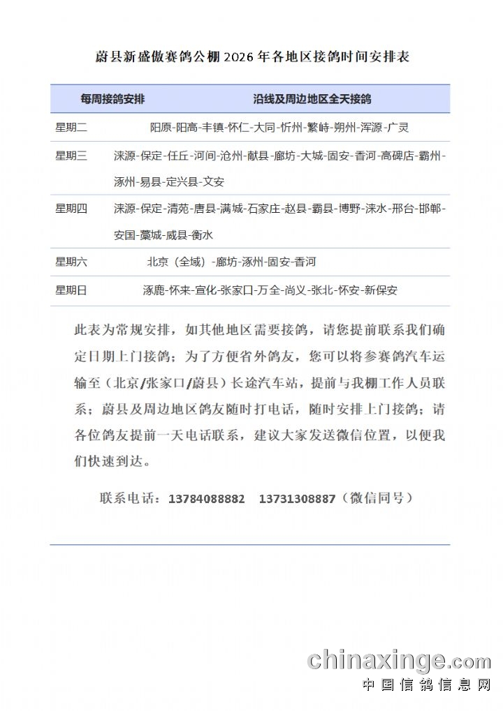 河北张家口蔚县新盛傲赛鸽公棚2026年各地区接鸽时间安排表