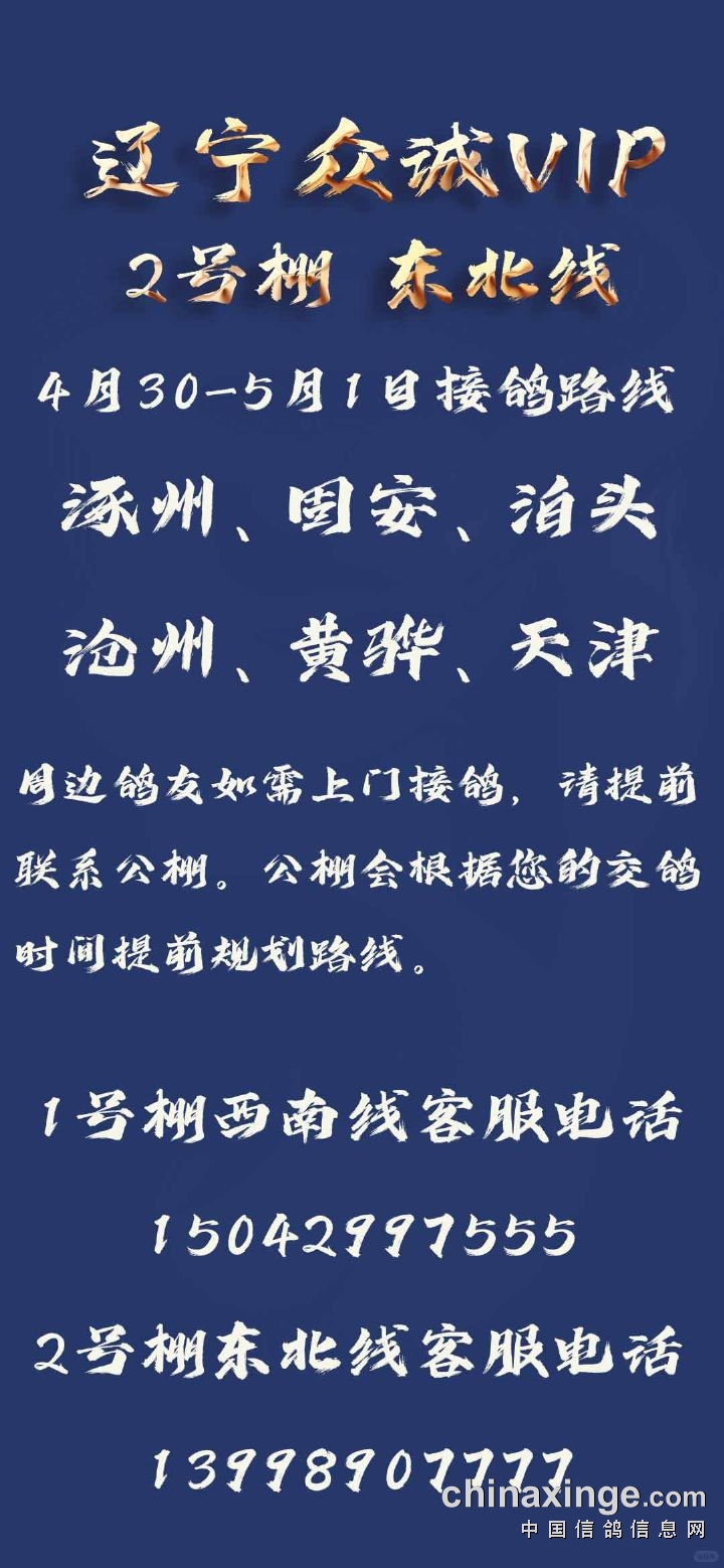 辽宁众诚VIP赛鸽公棚2号棚(东北线)4月28日河北地区全境接鸽