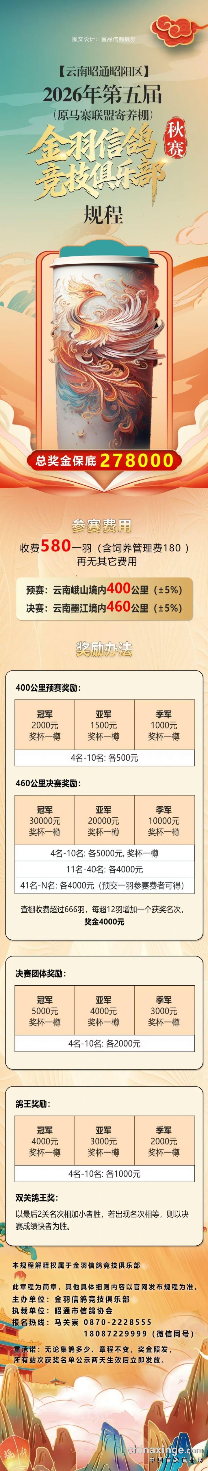 云南昭通昭阳区金羽信鸽竞技俱乐部(原马寨联盟寄养棚第五届)2026 年首届秋赛简规程