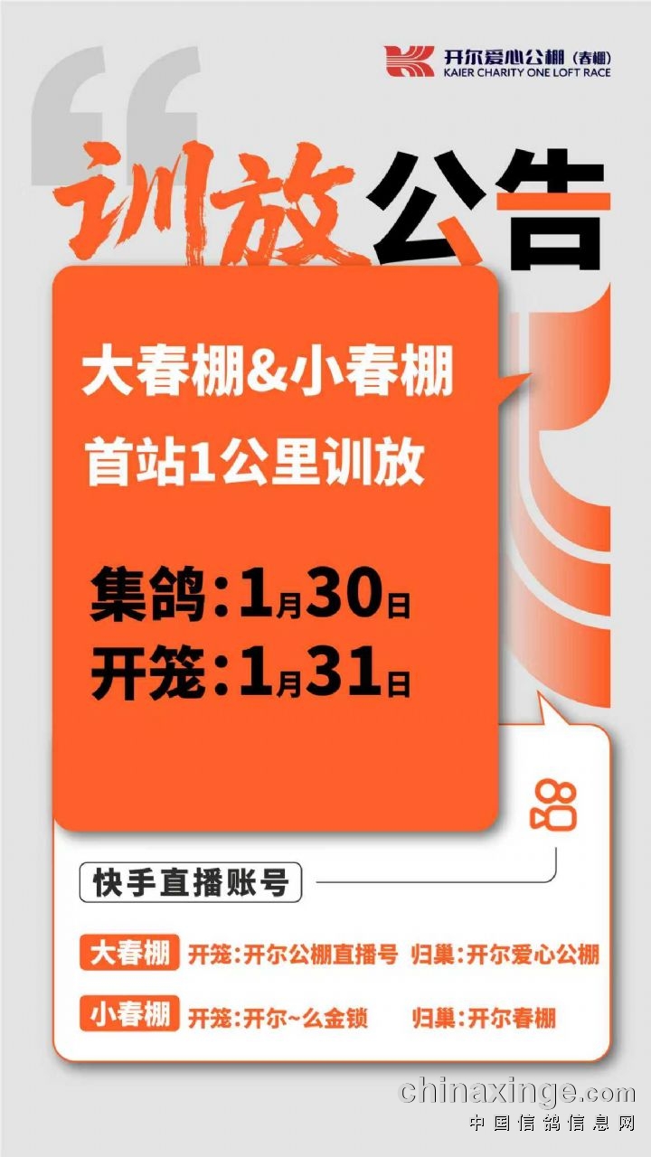 集鸽、开笼、归巢也将在开尔公棚快手矩阵账号同步直播。集鸽直播账号:大春棚:开尔爱心公棚、小春棚:开尔春棚;大春棚开笼直播账号:开尔公棚直播号,归巢直播账号:开尔爱心公棚;小春棚开笼直播账号:开尔~么金锁,归巢直播账号:开尔春棚。