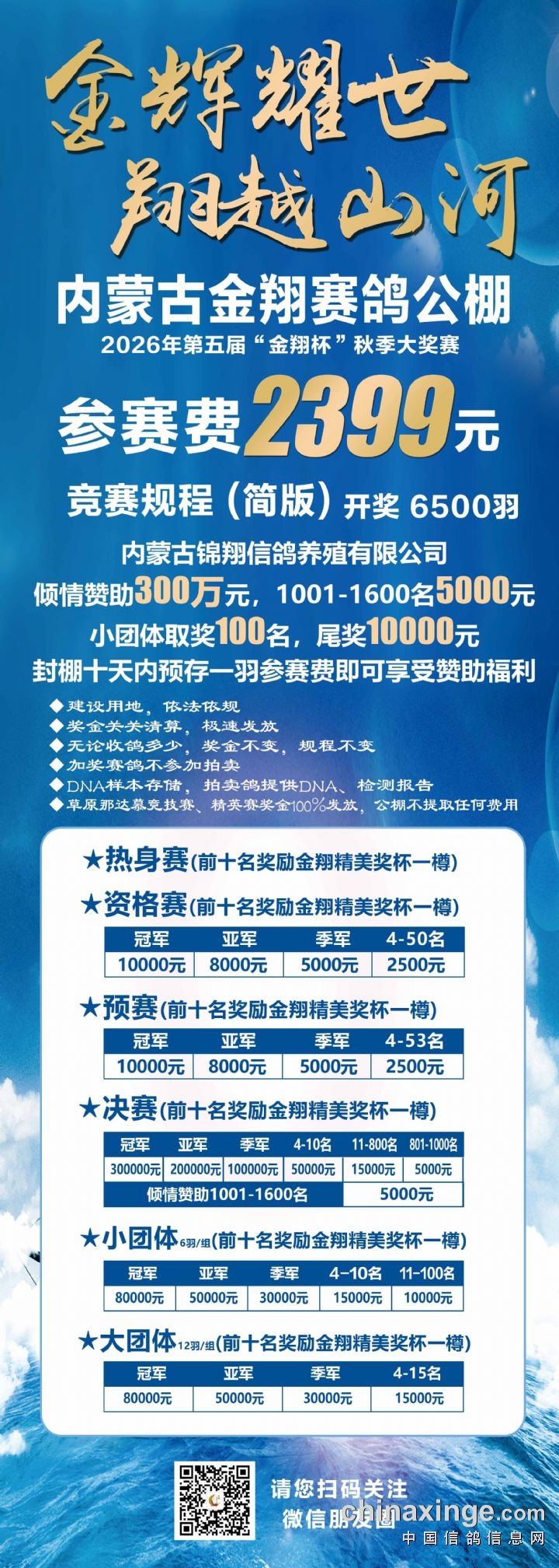 本届赛事秉持让利厚惠、轻负参赛理念,以更友好的参与门槛、更实在的入会礼遇,降低竞翔成本,让更多鸽友安心入棚、从容备战。公棚坚守公平、公正、公开原则,优化服务保障,提升赛事体验,诚邀各位鸽友抢先锁定席位,携手共赴秋赛荣光,共赏健儿凯旋风采。